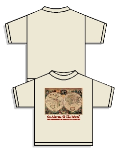 ![]() MAGNIFICENT ART The cartographer's art form was one of exquisitely executed, beautifully hand-colored engravings and woodcuts that are filled with sumptuous illustrations, elaborate borders and ornate motifs designed to capture their viewer's imagination and transport them to distant lands. ABOUT THE SHIRT Our Old World Map shirt features a process color seventeenth century Henricus Hondius world map printed on the front with customized organization name and/or saying printed below in matching brown ink. We offer the Old World Map Shirt on t-shirts and long sleeve t-shirts in white, natural, and sand. We recommend natural as it lends an "antique" feel to the shirt. Go to price list below to view colors. Click here to view a detailed representation of the back of the Old World Map Shirt. Click here to view recommended fonts for organization name and/or saying. Click here to view price list for World Flags Shirt.